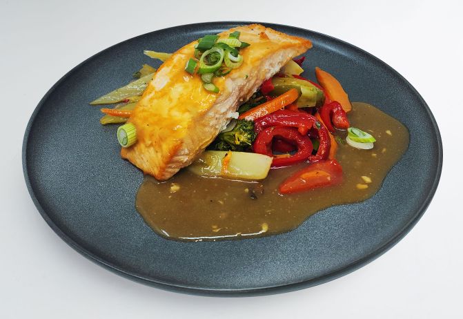 Salmon fillet with baby bok choy and Japanese mushroom medley