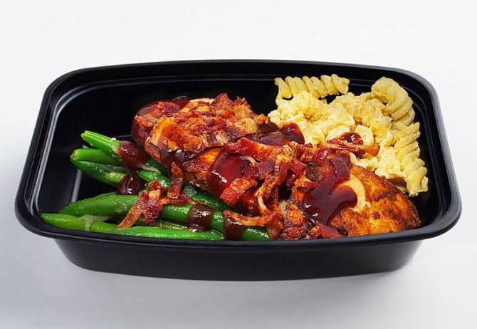 Pollo a la parrilla con macarrones con queso, judías verdes y tocino confitado